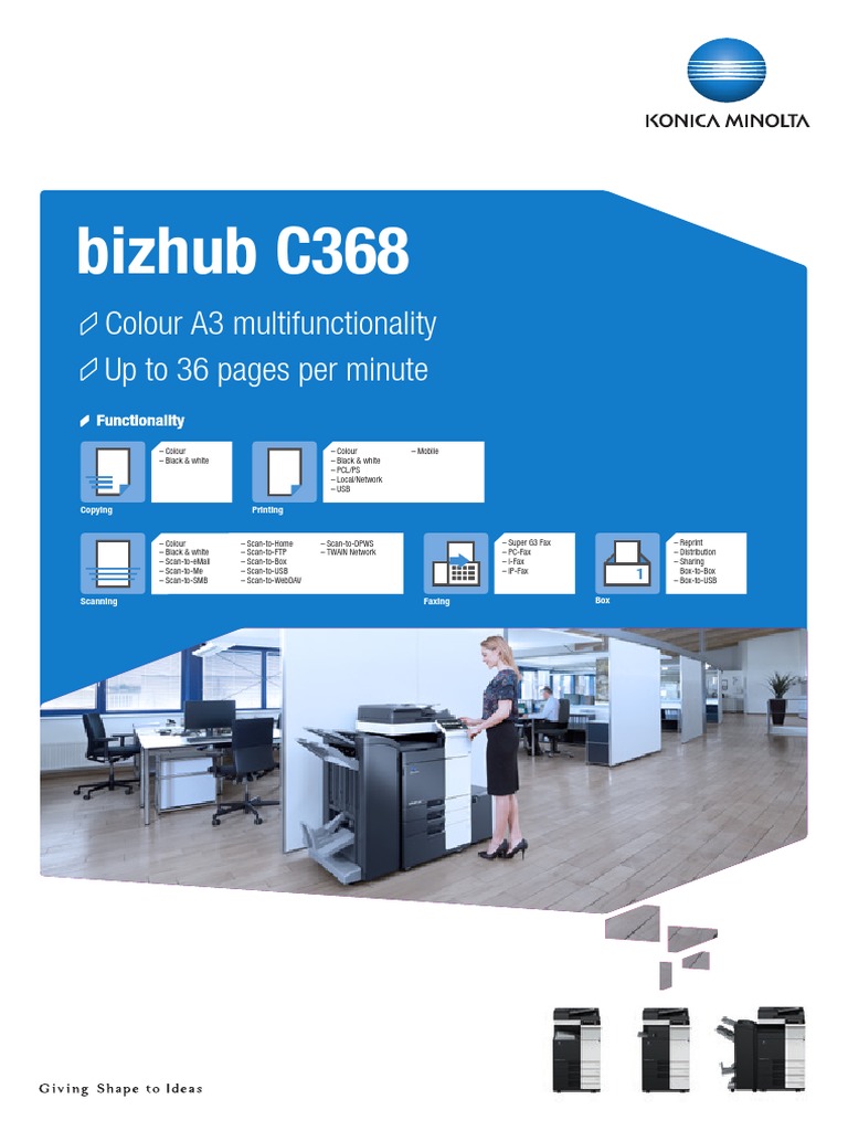 Konica Minolta Bizhub C368 (Lease) PAL Office Products - Ideal for growing businesses, the bizhub c368 is a powerful, affordable color mfp with superior simitri hd image quality and fast 36 ppm print/copy output. Bizhub c368/c308/c258 general specifications bizhub c368 bizhub c308 bizhub c258 colour/b&w: Bizhub c368 a3 multifunctional with 36 ppm b/w and colour. Standard emperon™ print controller with pcl 6c, postscript 3, pdf 1.7 and xps support.. You should also read this: 2006 Honda Accord Brochure